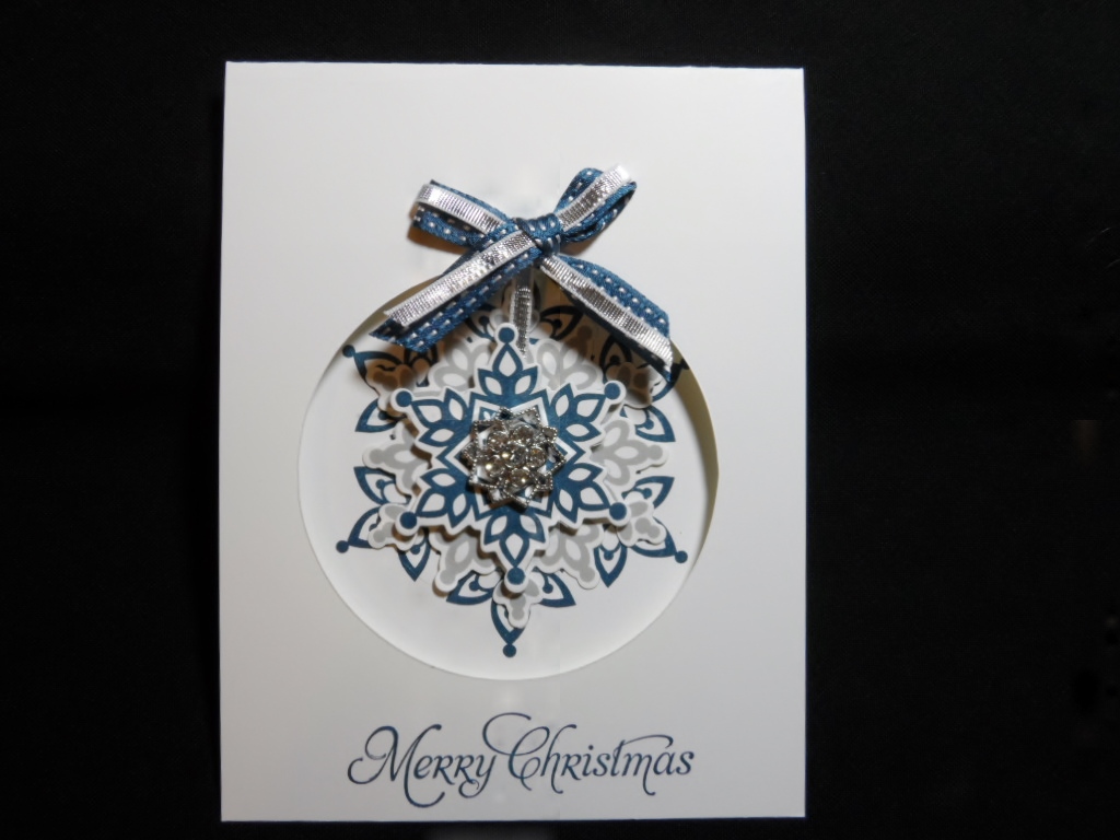 I used the 3" Circle Die to cut through the top layer of the card and an additional piece of Whisper White cardstock. The top layer created the circle opening on the card. The second piece I used to layer on the inside, back cover which hides the ribbon I used to hang the snowflake. The new silver ribbon and Frosted Finishes Embellishment give this card real sparkle. The best news about this card, the inside layer of Whisper White cardstock can be removed to reveal the snowflake which can be used by the recipient as an ornament, gift bag decoration or even a gift tag. Gotta love a card that keeps on giving!